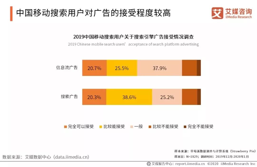 數(shù)據(jù)顯示,中國移動搜索用戶對廣告的接受程度較高,46.2%的用戶表示能夠接受信息流廣告,58.9%的用戶表示能夠接受搜索廣告。