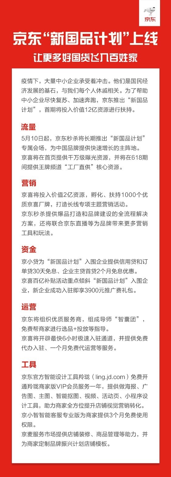 為了幫助中小企業(yè)盡快復(fù)蘇,京東宣布推出“新國品計劃”,首期拿出價值12億資源進行扶持。