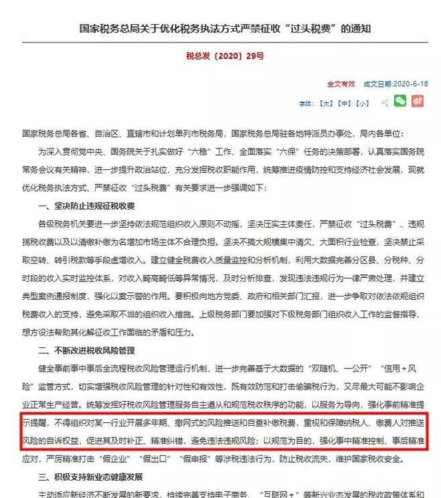 近日,國(guó)家稅務(wù)總局在網(wǎng)站公布了《關(guān)于優(yōu)化稅務(wù)執(zhí)法方式嚴(yán)禁征收“過(guò)頭稅費(fèi)”的通知》。通知中明確要求各級(jí)稅務(wù)機(jī)關(guān),不得組織對(duì)某一行業(yè)開(kāi)展多年期、撒網(wǎng)式的風(fēng)險(xiǎn)推送和自查補(bǔ)繳稅費(fèi)。