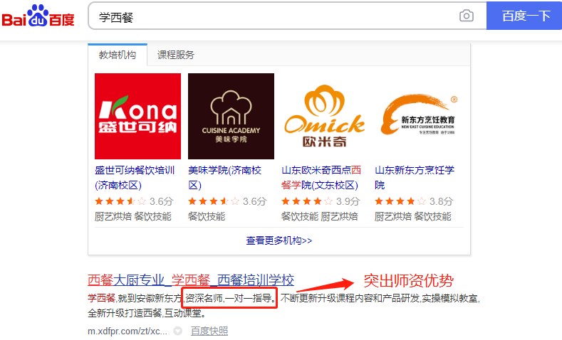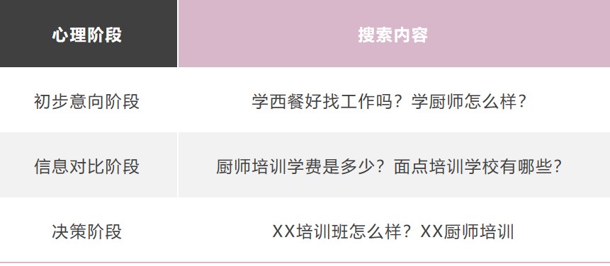 搜索是出于用戶的主動行為,行為背后反映了用戶在不同心理階段的不同需求。以廚師培訓為例: