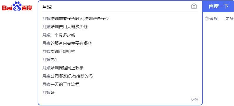 百度下拉框中當鍵入某個詞組時,下拉列表中存在不少提示,這些提示都是與之相關的長尾關鍵詞。家政企業(yè)可以圍繞家政培訓相關關鍵詞進行思路擴展,增加一些修飾詞短語,例如:月嫂好找工作嗎?家政好干嗎?前景怎么樣?