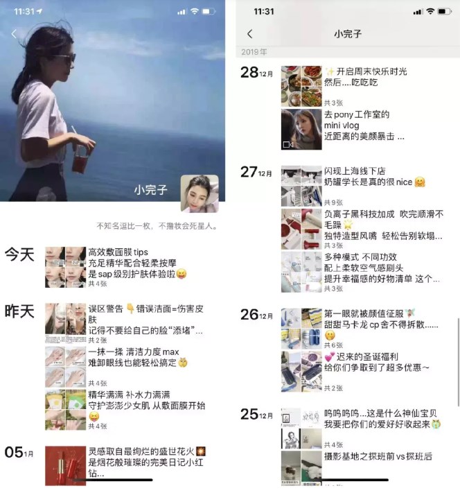 首先,完美日記給自己的微信打造了個人設(shè)——“小完子”。她的朋友圈并不全都是產(chǎn)品廣告,而是會經(jīng)常在朋友圈發(fā)自拍,發(fā)網(wǎng)紅店打卡照,發(fā)美食照,具有十足的“人性”和生活氣息。在介紹產(chǎn)品時,則會用專業(yè)的測評、真人試用圖片凸顯自身的專業(yè)性。