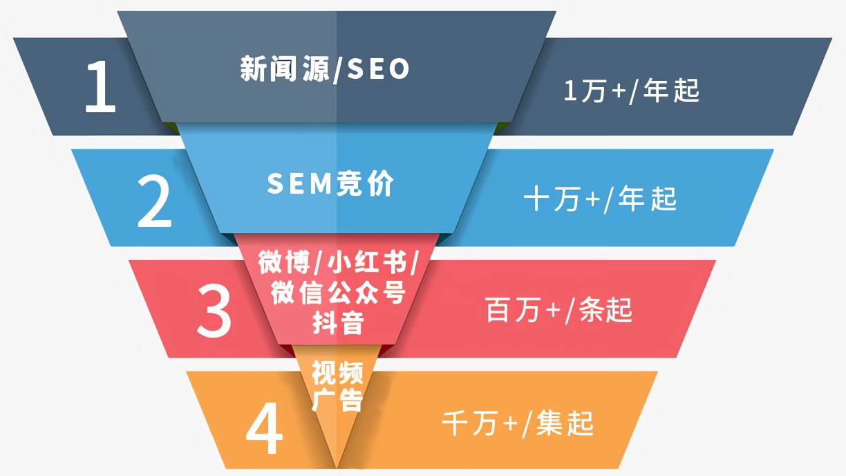 目前的線上媒體廣告投放渠道按價格從高到低排序,可以分為以下五個等級:互聯(lián)網(wǎng)視頻廣告、微博廣告、小紅書/抖音/微信公眾號、SEM競價、新聞源/SEO。